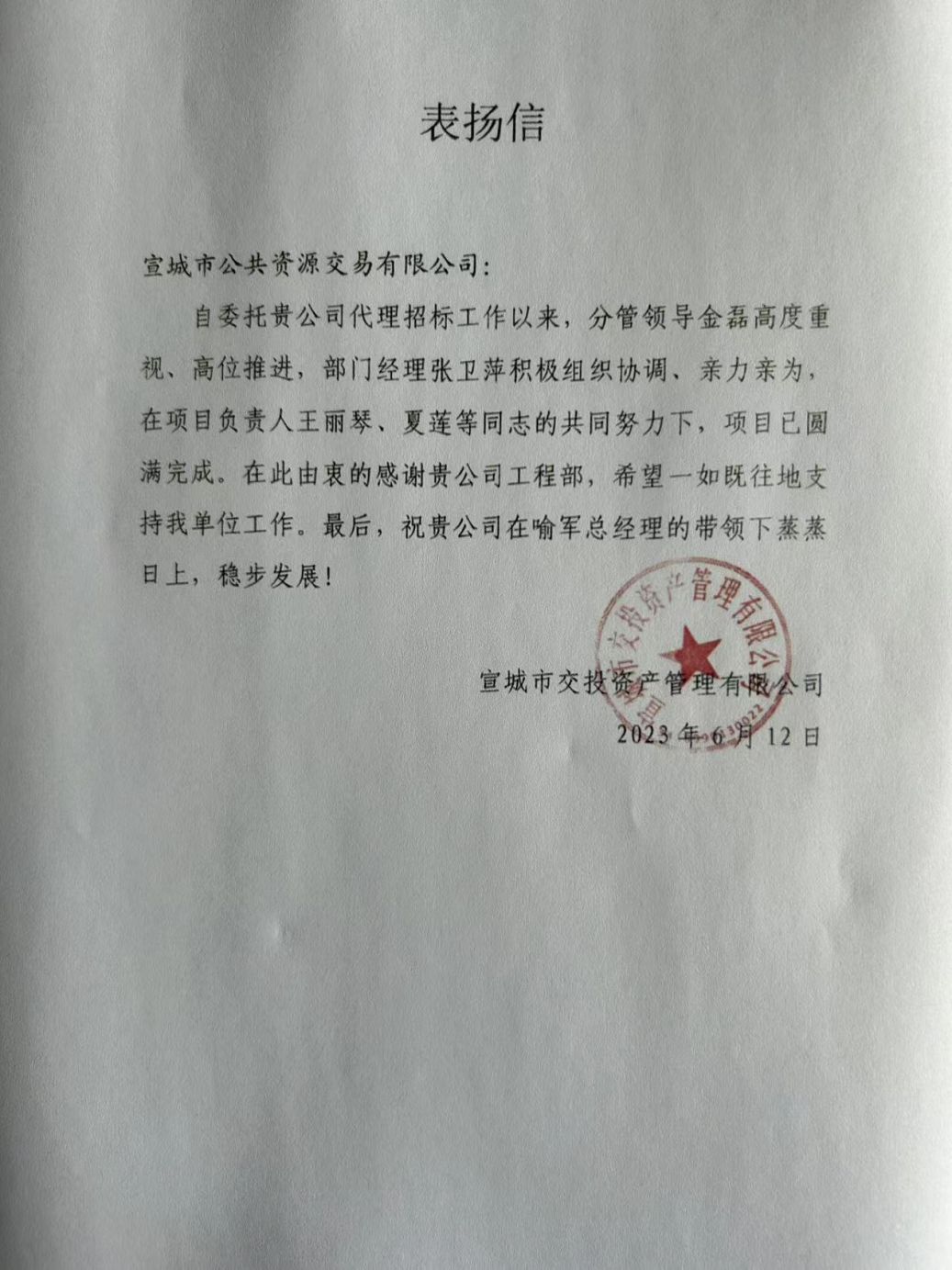 表揚信-宣城市交投資產(chǎn)管理有限公司